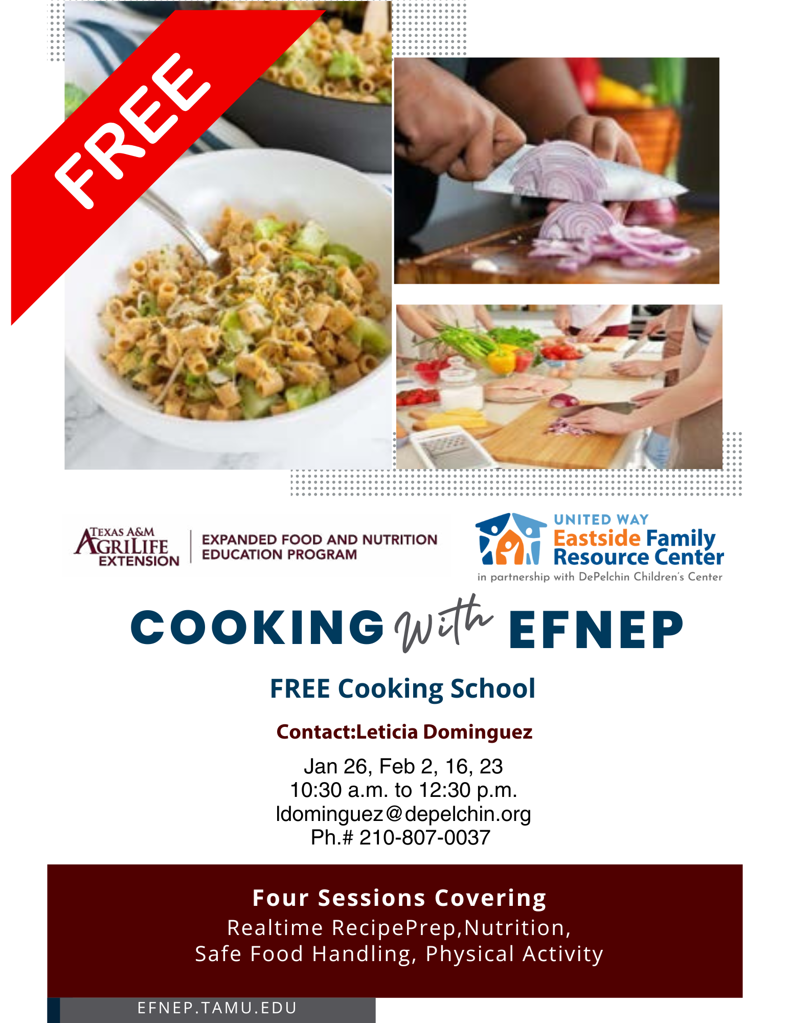 Expanded food and nutrition education program with Texas A&M AgriLife. We will be offering free cooking classes on Jan 26, February 2, February 16, and February 23rd. Class time will be 10:30am-12:30pm on all dates. Contact information is listed in the attached English and Spanish flyers.