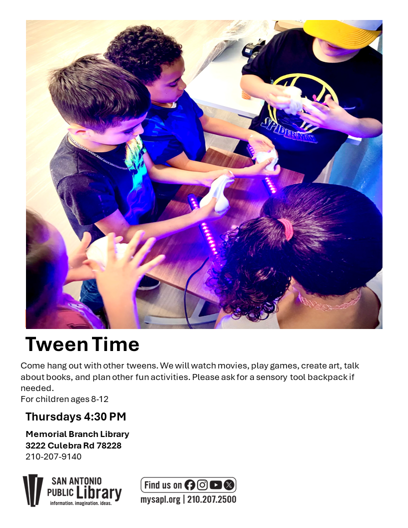 Calling all children ages 8-12 years old! Come create, play games, and have fun with other tweens! Please ask for a sensory tool backpack if needed. Children ages 8-12 years...