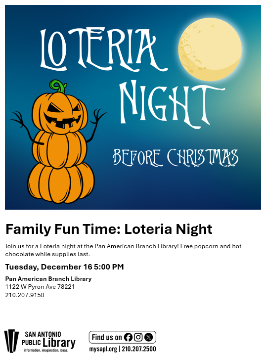 Join us for a Loteria night at the Pan American Branch Library! Free popcorn and hot chocolate while supplies last.